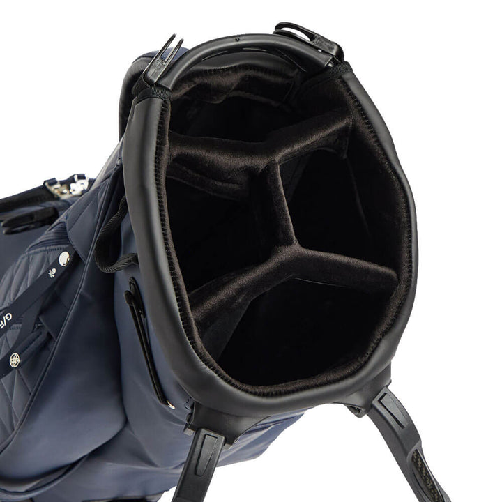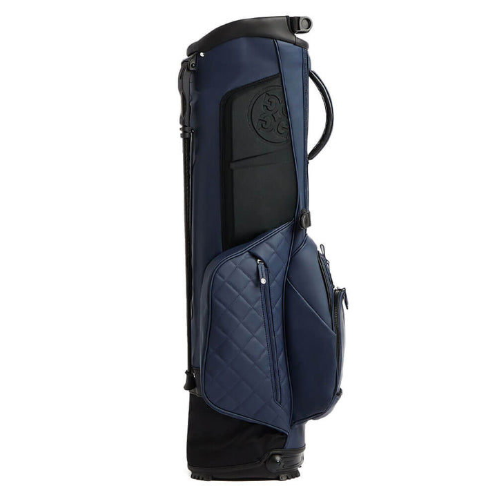 Our Best-selling carry bag features a 4-way top designed with a velour lining for maximum club protection, a rotator stand system for maximum stability, a self-adjusting convertible strap for automatic equal distribution, and a compression molded neoprene back panel for comfort. The daytona plus features elevated grosgrain detailing and quilted panels, plus a self-coloured rain hood, and an umbrella holder. It's also equipped with several pockets, including a large garment compartment, water resistant pocket for personal items, cooler-lined water bottle sleeve, magnetic velour-lined rangefinder pocket, and a pen pocket. Weighs 5.75 lbs.