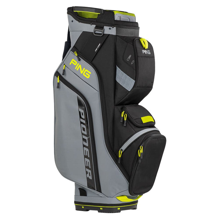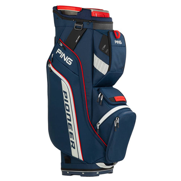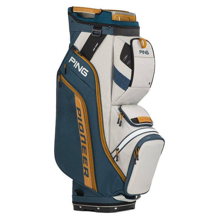 Quality is in the details in Ping bags, and that's abundantly clear in the Pioneer. Among the 14 pockets are a drop-down ball pocket and rangefinder pocket, both magnetic, a cooler pocket and velour-lined multi-use pocket. A 15-way top makes organizing clubs a breeze.